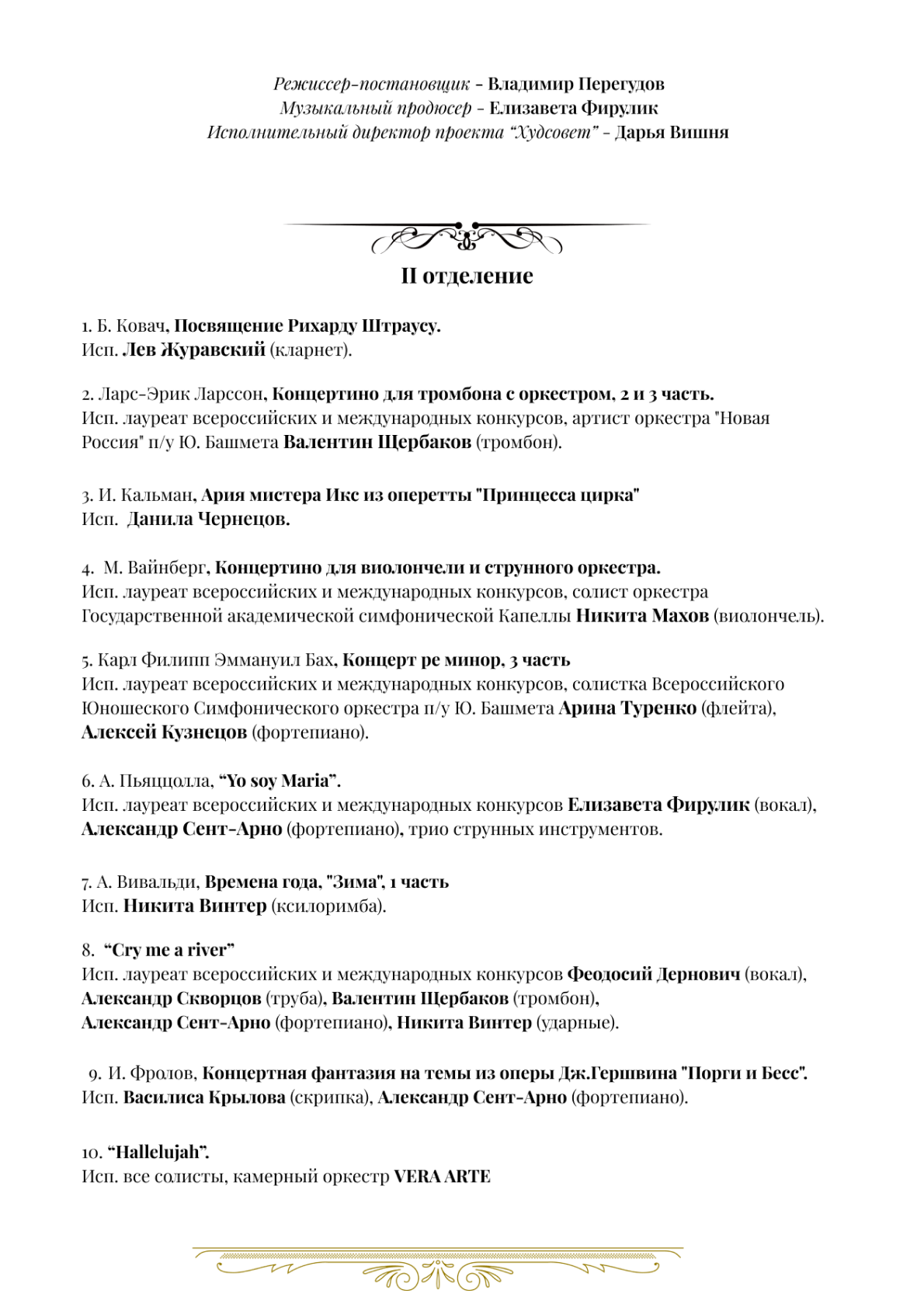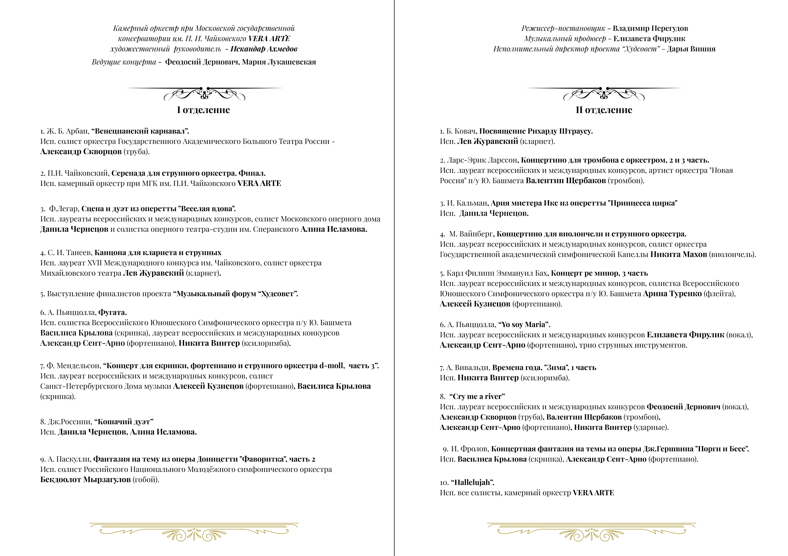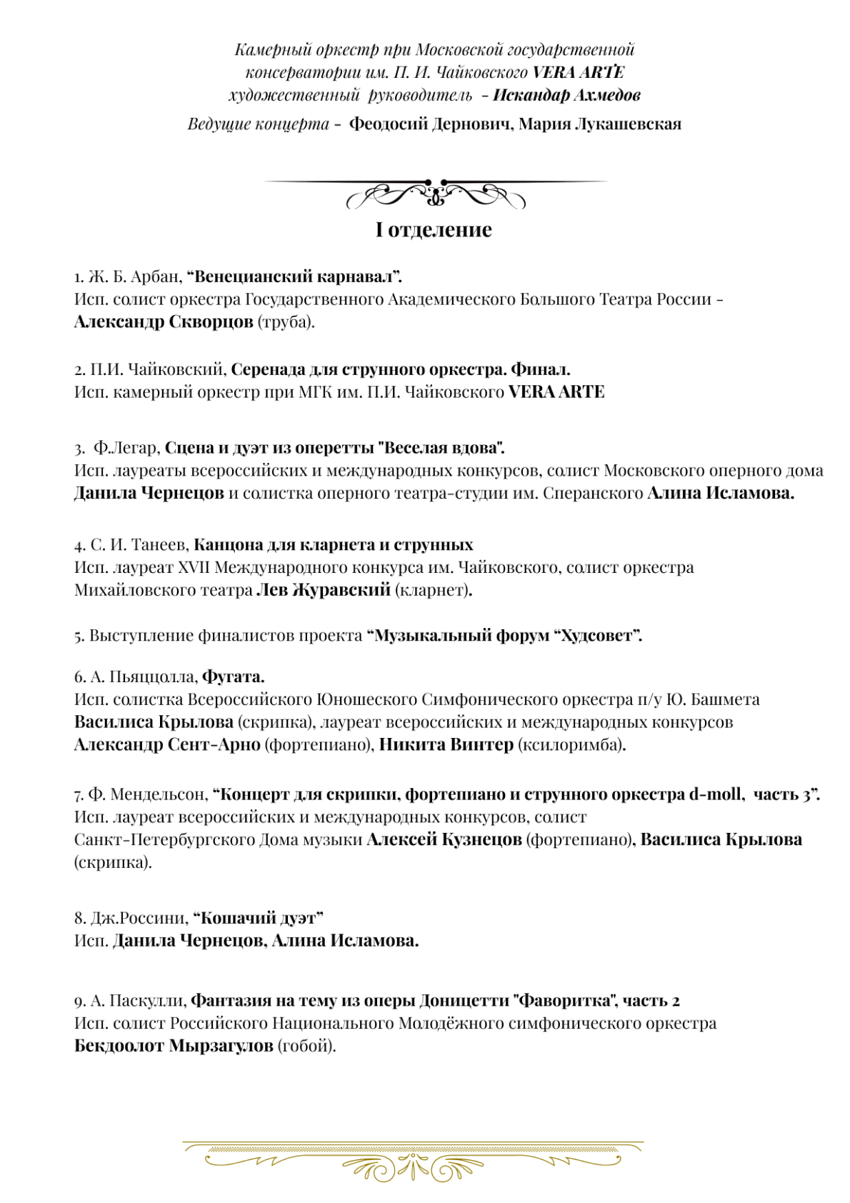 В программе – Бах и Чайковский, Пьяццолла и Мендельсон, Вивальди и Гершвин, Арбан и Танеев, Вайнберг и Кальман… Скрипка, кларнет, труба, тромбон, гобой, виолончель, ксилоримба, фортепиано, флейта — целая россыпь солирующих инструментов. Многообразие жанров и музыкальных эпох. И замечательные голоса!